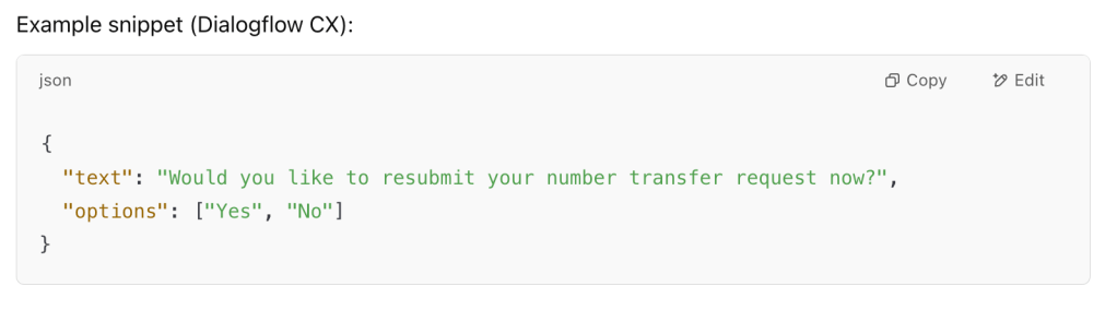 Example snippet (Dialogflow CX):