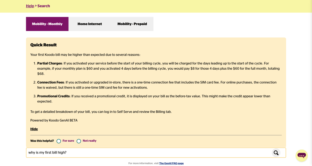 Koodo’s Help page saw frequent user drop-offs and repetitive search queries that didn’t convert into meaningful resolutions. Users often got overwhelmed with the volume of static FAQs or couldn’t find what they needed quickly enough. Koodo needed a smarter search tool, scalable solution to improve self-service and reduce support calls.