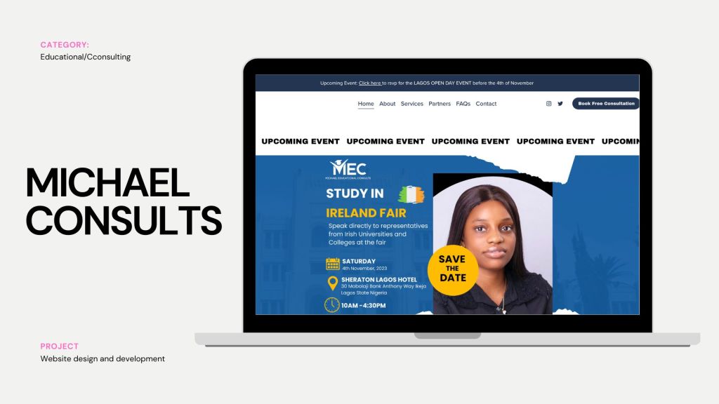 Introducing MICHAEL CONSULTS, an innovative educational consulting agency that combines expertise and personalized guidance to empower students on their academic journey. As the designer and developer behind this dynamic website, I infused it with a seamless blend of creativity and functionality. Through a user-centric approach, I’ve showcased my proficiency in user experience (UX) design, ensuring that visitors navigate effortlessly through the site. The interface reflects my keen eye for detail, with intuitive layouts and engaging visuals that captivate the audience.