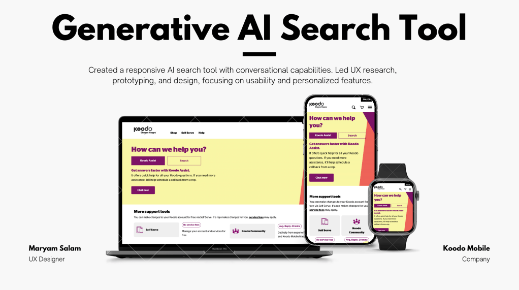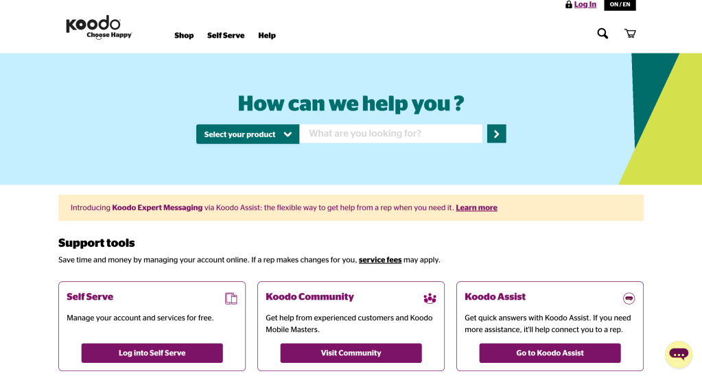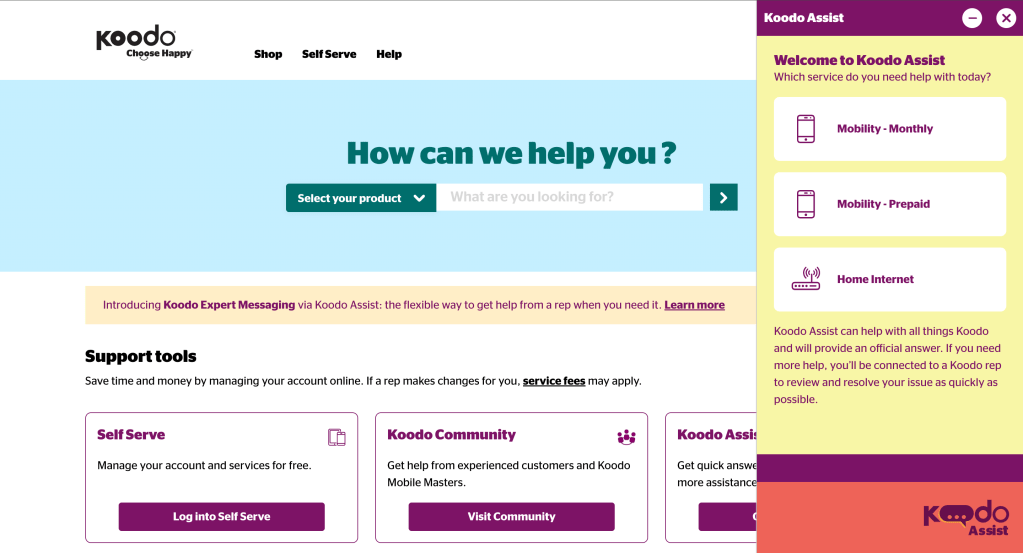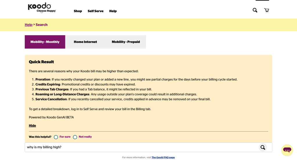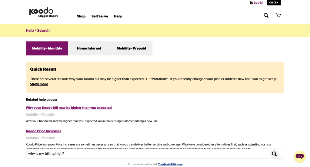 Koodo’s Help page saw frequent user drop-offs and repetitive search queries that didn’t convert into meaningful resolutions. Users often got overwhelmed with the volume of static FAQs or couldn’t find what they needed quickly enough. Koodo needed a smarter, scalable solution to improve self-service and reduce support calls.